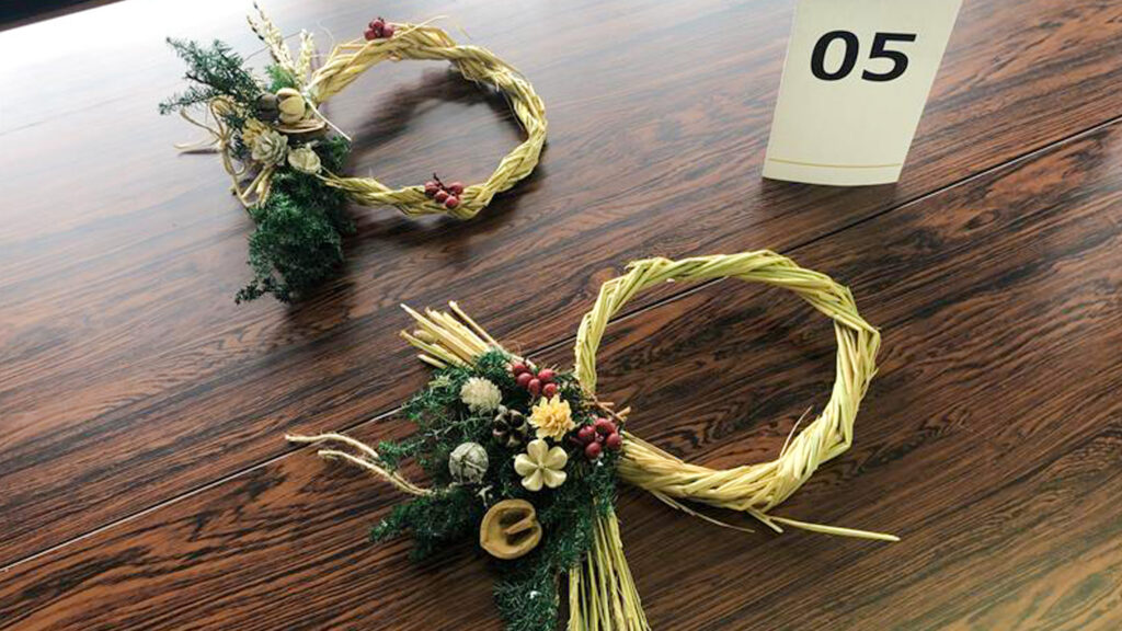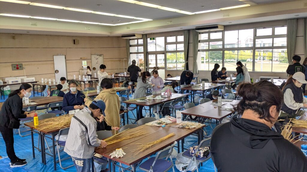 また、会場では、収穫した稲わらを使った「リースづくりワークショップ」を実施。参加者は、自分たちが育てた稲のわらを編み、それぞれ自由に飾りつけて、世界にひとつだけのリースを完成させました。「リースづくりが楽しかった」「飾るのが楽しみ」といった声が聞かれ、会場は終始和やかな雰囲気に包まれました。