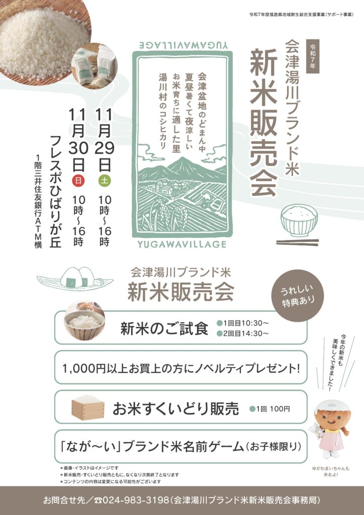 フレスポひばりが丘にて、11月29日と30日、湯川村ブランド米販売会を開催します。販売会では、試食や楽しいゲームなども企画しております。お買い上げのお客様にはノベルティも差し上げます。