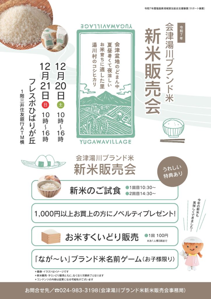フレスポひばりが丘にて、12月20日と21日、湯川村ブランド米販売会を開催します。販売会では、試食なども企画しております。お買い上げのお客様にはノベルティも差し上げます。