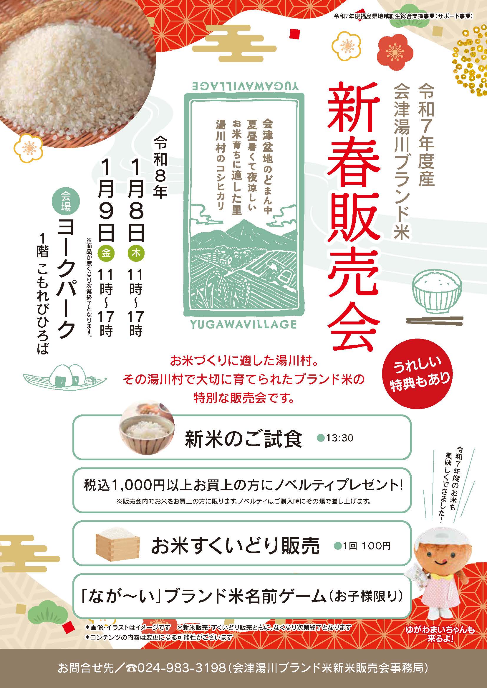 ヨークパーク(郡山市)にて、R8年1月8日と9日、湯川村ブランド米新春販売会を開催します。 販売会では、試食や楽しいゲームなども企画しており、お買い上げのお客様にはノベルティも差し上げます。 郡山市では初開催となります。この機会に湯川村ブランド米をお求めください。 日程: 令和8年1月8日(木)11…