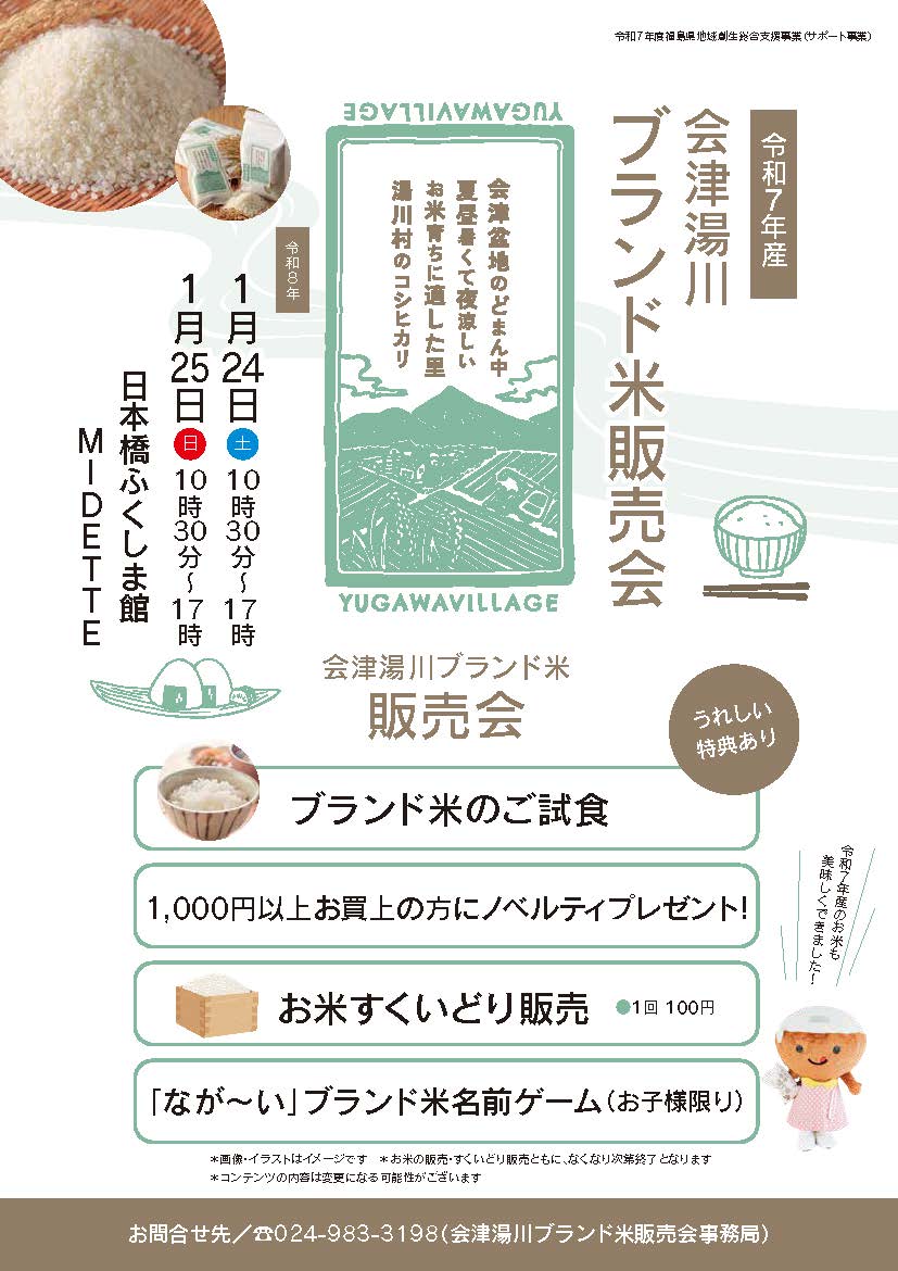 ミデッテ『湯川村ブランド米販売会』開催のお知らせ 日本橋ふくしま館 - MIDETTE(ミデッテ)にて、R8年1月24日と25日、湯川村ブランド米販売会を開催します。 販売会では、試食や楽しいゲームなども企画しており、お買い上げのお客様にはノベルティも差し上げます。 都内でもご好評をいただいておりま…